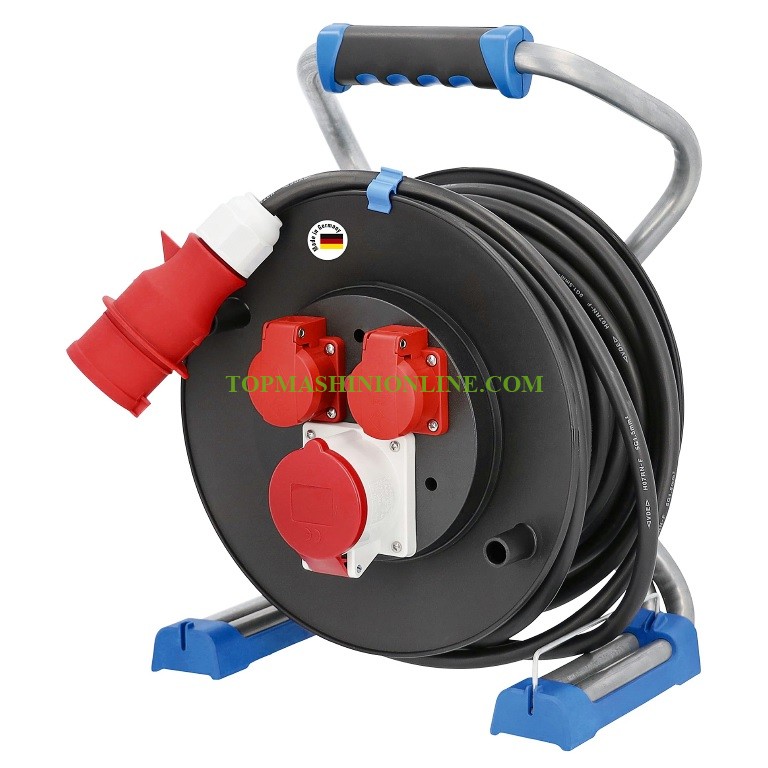 Удължител на макара as - Schwabe 23654 с корпусът на барабана от здрава, устойчива на счупване специална пластмаса, със стабилна, амортизираща двойна тръбна рамка, със спирачка със звезден захват. Рамката е с ергономична, неплъзгаща се двукомпонентна дръжка и кабелно трасе. С вграден превключвател за термозащита, CEE щепсел 400 V, 16 A, 5-пина, с 2 защитени контакта 230 V с предпазни капаци и 1 CEE контакт 400 V, 16 A, 5-пина и 40 м гумен кабел H07RN-F 5х1.5 мм2 за тежки приложения.