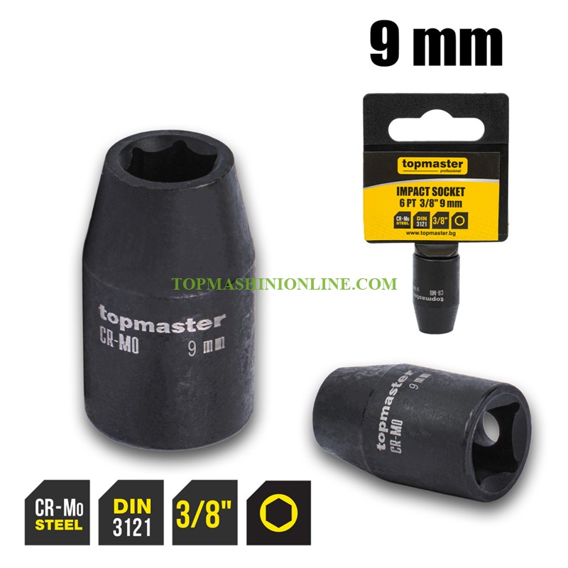 Шестостенна ударна вложка 3/8", 9 мм Top Master Pro 330804 e изработена от хром-молибденова стомана (Cr-Mo), закалена по DIN 3121, тя осигурява висока здравина и устойчивост на деформации. 6-стенният профил защитава болтовете и гайките, позволявайки работа с корозирали или силно затегнати крепежи. Подходяща е за ударни гайковерти, тресчотки и ръчни инструменти, използва се в автосервизи, монтажни линии и индустриални приложения.