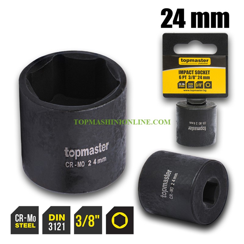 Шестостенна ударна вложка 3/8", 24 мм Top Master Pro 330818 e произведена от Cr-Mo хром-молибденова стомана и термично закалена по стандарт DIN 3121, тя предлага изключителна устойчивост при ударно натоварване и продължителна експлоатация. Шестостенният профил гарантира сигурно захващане и ефективно предаване на въртящия момент. Подходяща за индустриални приложения, автомобилни ремонти и професионални сервизи. Съвместима и с всички ударни гайковерти и ръчни инструменти с квадрат 3/8".