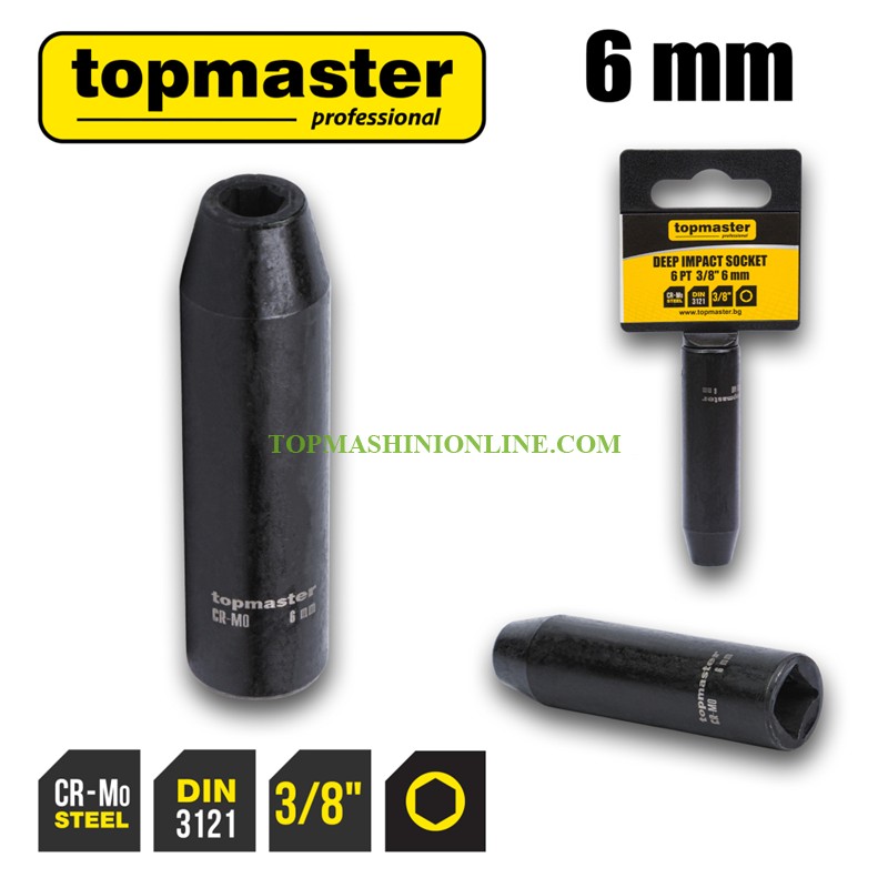 Шестостенна удължена ударна вложка 3/8", 6 мм Top Master Pro 330819 e изработена от висококачествена хром-молибденова стомана (Cr-Mo), с 6-стенна конструкция за сигурен захват и равномерно предаване на въртящия момент. Удълженият дизайн осигурява лесен достъп до дълбоко разположени болтове и гайки. Оборудвана с отвор за заключващ пин, който позволява сигурно фиксиране към ударния инструмент и предотвратява случайно освобождаване по време на работа. Вложката е закалена по стандарт DIN 3121 за висока издръжливост и дълъг експлоатационен живот.
