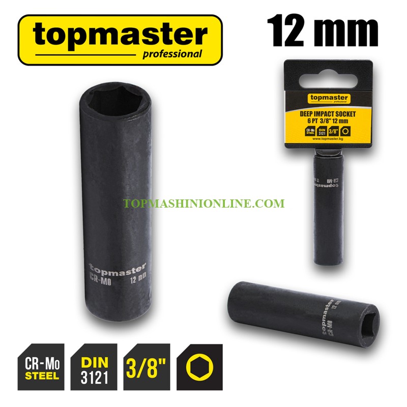Шестостенна удължена ударна вложка 3/8", 12 мм Top Master Pro 330825 e изработена от висококачествена хром-молибденова стомана (Cr-Mo), с 6-стенна конструкция за сигурен захват и равномерно предаване на въртящия момент. Удълженият дизайн осигурява лесен достъп до дълбоко разположени болтове и гайки. Оборудвана с отвор за заключващ пин, който позволява сигурно фиксиране към ударния инструмент и предотвратява случайно освобождаване по време на работа. Вложката е закалена по стандарт DIN 3121 за висока издръжливост и дълъг експлоатационен живот.