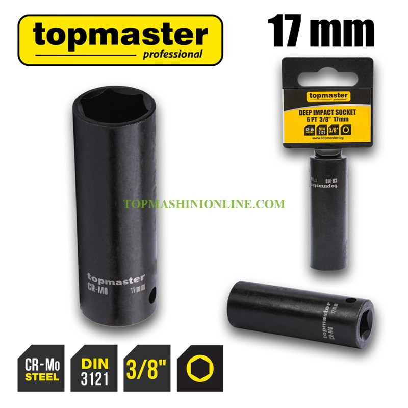 Шестостенна удължена ударна вложка 3/8", 17 мм Top Master Pro 330830 e изработена от висококачествена хром-молибденова стомана (Cr-Mo), с 6-стенна конструкция за сигурен захват и равномерно предаване на въртящия момент. Удълженият дизайн осигурява лесен достъп до дълбоко разположени болтове и гайки. Оборудвана с отвор за заключващ пин, който позволява сигурно фиксиране към ударния инструмент и предотвратява случайно освобождаване по време на работа. Вложката е закалена по стандарт DIN 3121 за висока издръжливост и дълъг експлоатационен живот.